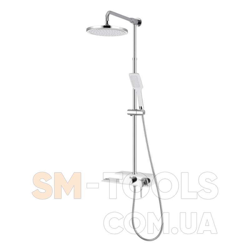 Смеситель, кронштейн для верхнего душа, лейка для верхнего душа, кронштейн для ручного душа, лейка для ручного душа, душевой шланг, душевая стойка, крепежи.