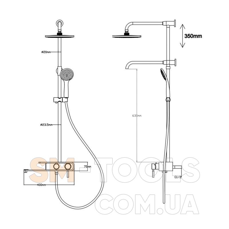 Диаметр лейки, мм: Ручной душ: 110. Верхний душ: 230