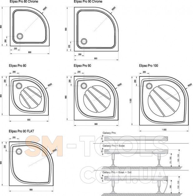 Для установки поддонов серии Galaxy PRO на пол ванной комнаты необходимо использовать набор ножек (Galaxy PRO BASE) и по желанию переднюю панель с крючками (SET).
