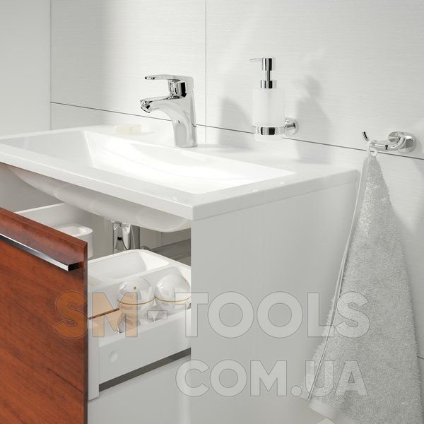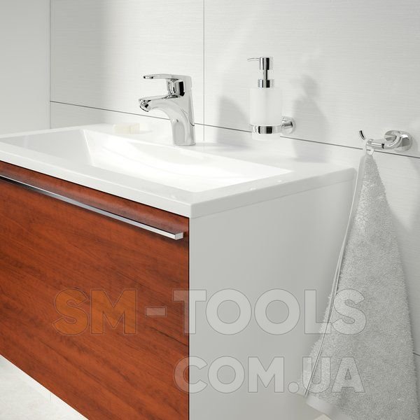 Глубина умывальника и шкафчика составляет почти 40 см. Горизонтальная форма шкафчика, подчеркнутая тонкой декоративной планкой, визуально увеличивает пространство ванной комнаты.