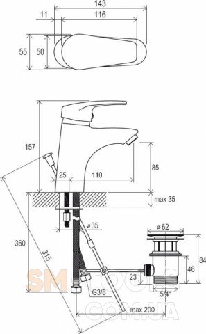 Особенности: Керамический картридж Ø 35 мм, Гибкая подводка G 3/8, С открыванием стока