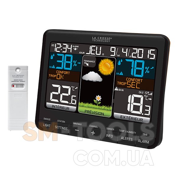Метеостанция с контрастным цветным ЖК-дисплеем, прогнозом погоды на ближайшие 12 часов, измерением внутренней и внешней температуры и относительной влажности и USB-портом для зарядки мобильных устройств.