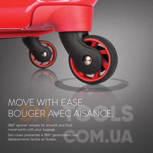 Чемодан оснащен четырьмя полноповоротными колесами системы Spinner с возможностью независимого разворота каждого колеса на 360 °. Системой предусмотрено равномерное перераспределения нагрузки на каждое колесо, что в свою очередь способствует плавному качению и маневренности чемодана, прилагая при этом минимум усилий.