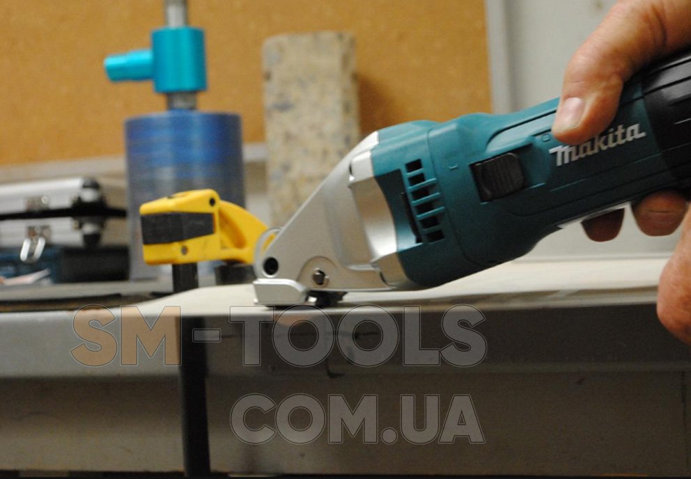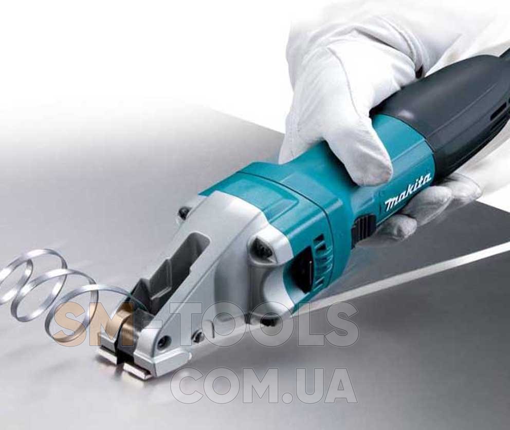 Листовые ножницы по металлу Makita JS1601 в основном используются для прямого реза. Длина окружности корпуса двигателя всего 180 мм, достигнута за счет не выступающих щеткодержателей и форма максимально приближена к идеальному кругу. Эргономичный корпус двигателя и задняя крышка с ребристой поверхностью обеспечивает надежное управление инструментом.