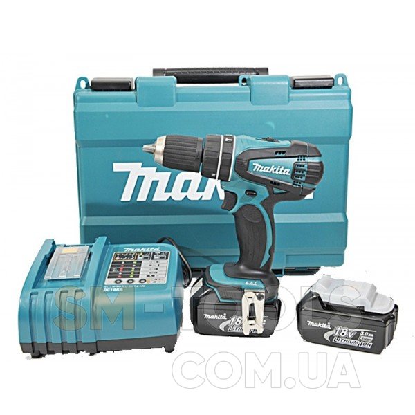 В комплект поставки, кроме ударной дрели-шуруповерта Makita BHP456RFE входит также 2 аккумулятора BL1830, зарядное устройство, быстрозажимной патрон, насадка №2, крючок для кабеля и чемодан для транспортировки.
