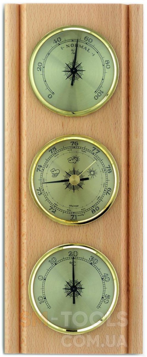 Используется внутри помещения, измеряет атмосферное давление, температуру от -10°C до +50°C и относительную влажность воздуха от 20 до 100%. Материалы изготовления — дерево, бук. Настенная установка. Диаметр циферблатов: гигрометр — 70 мм; барометр — 70 мм; термометр — 70 мм.