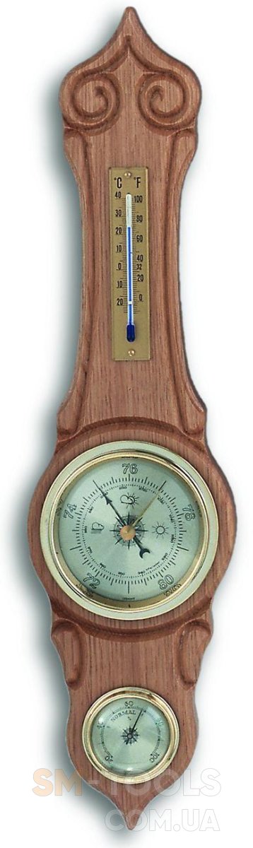 Используется внутри помещения, измеряет атмосферное давление, температуру от -20°C до +40°C и относительную влажность воздуха от 20 до 100%. Материалы изготовления — дерево, светлый дуб. Настенная установка. Диаметр циферблатов: гигрометр — 40 мм; барометр — 80 мм. Жидкостный термометр.
