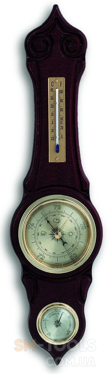 Используется внутри помещения, измеряет атмосферное давление, температуру от -20°C до +40°C и относительную влажность воздуха от 20 до 100%. Материалы изготовления — дуб, цвет — красное дерево. Настенная установка. Диаметр циферблатов: гигрометр — 40 мм; барометр — 80 мм. Жидкостный термометр.