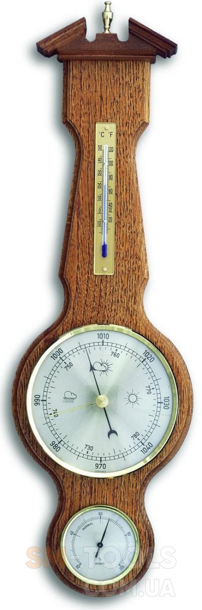 Используется внутри помещения, измеряет атмосферное давление, температуру от -10°C до +50°C и относительную влажность воздуха от 20 до 100%. Материалы изготовления — дерево, дуб. Настенная установка. Диаметр циферблатов: гигрометр — 70 мм; барометр — 135 мм. Жидкостный термометр.
