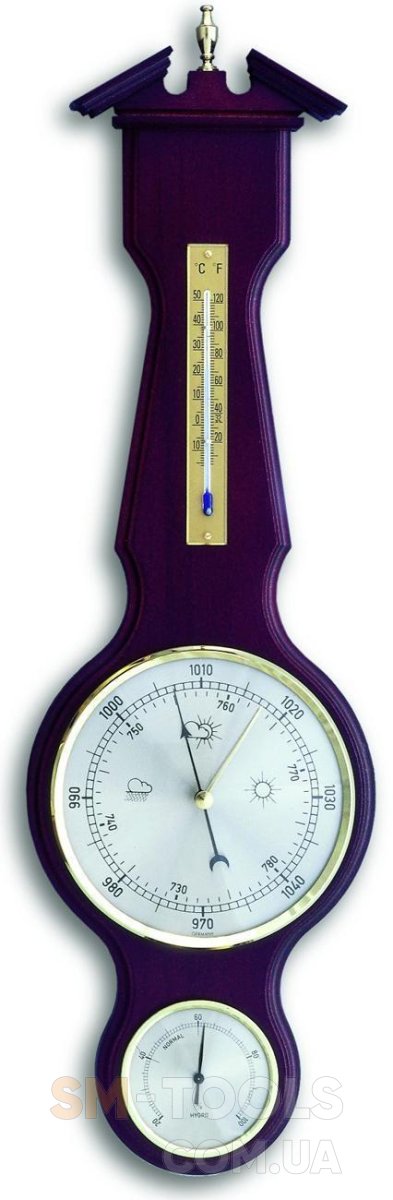 Используется внутри помещения, измеряет атмосферное давление, температуру от -10°C до +50°C и относительную влажность воздуха от 20 до 100%. Материалы изготовления — дуб, цвет — красное дерево. Настенная установка. Диаметр циферблатов: гигрометр — 70 мм; барометр — 136 мм. Жидкостный термометр.
