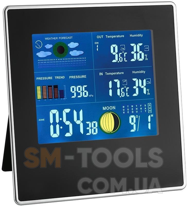 Многофункциональная стационарная метеостанция выполненная из тонкого черного пластика. Имеет цветной LCD-дисплей. Измеряет температуру воздуха внутри помещения - диапазон измерения от -10°C до +50°C; измерение внешней температуры - от -25°C до +50°C. Есть функция фиксации Min/Max значений температуры. Измеряет влажность от 20% до 99%. Прогноз погоды на ближайшие 12-24 часа показывает в виде символов - солнечно, небольшая облачность, облачность, дождливо, сильный дождь, снегопад, метель. Присутствует шкала измерения атмосферного давления за последние 12 часов. Настольная и настенная установка метеостанции. Питание метеостанции - от сети с помощью адаптера переменного тока 50 Гц или 3 х 1,5 V AA. Беспроводной датчик работает от 2 х 1,5 В батареек ААА.