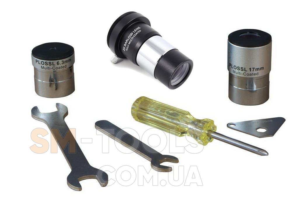 Отличительной особенностью данной модели является наличие в комплекте высококачественных окуляров Plossl 6,3 мм (142x), 1,25" и Plossl 17 мм (52x), 1,25" с просветляющим покрытие multi-coated.