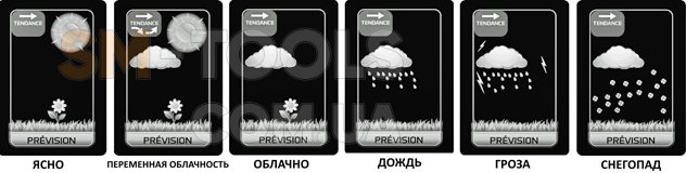 Символьный прогноз погоды . На дисплее отображаются пиктограммы (ясно, переменная облачность, облачно, дождь, гроза, снегопад)