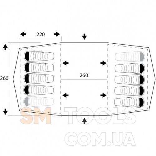 Палатка для 8-10 человек. Комфортная семейная палатка для кемпинга или база для занятий спортом. Просторный тамбур можно использовать как помещение для застолья, приготовления пищи или в качестве запасного спального места.
