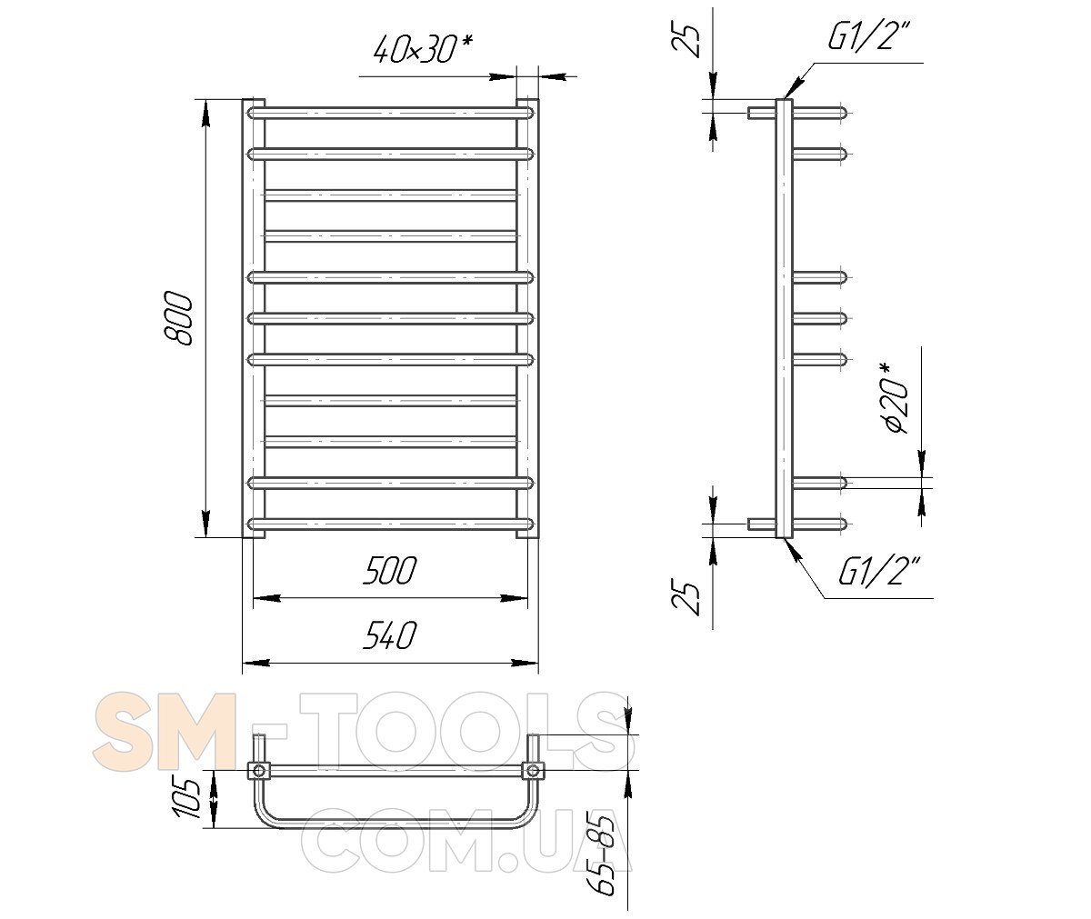 Водяной полотенцесушитель Премиум Люкс 800х500 с межосевым растоянием для подключения 500мм, диметр подключения G 1/2'' состоит из 11 ребер. Полотенцесушитель Премиум Люкс производсветнного предприятия Mario изготовлен из нержавеющей стали АІSI 304 может быть оборудован 300W электрическим теном.