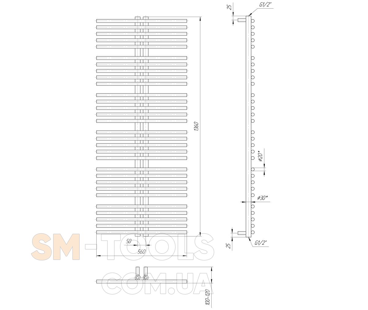 Водяной полотенцесушитель Рим 1360x560 с межосевым растоянием для подключения 50мм, диметр подключения G 1/2'' состоит из 30 ребер. Полотенцесушитель Рим производсветнного предприятия Mario изготовлен из нержавеющей стали АІSI 304 может быть оборудован 600W электрическим теном.