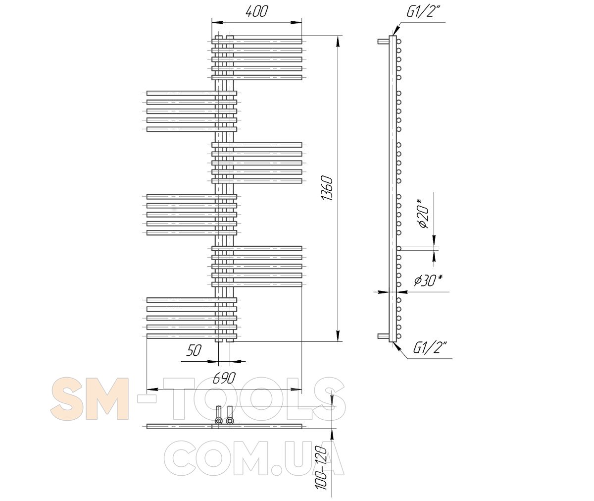 Водяной полотенцесушитель Премиум Симфония 1360x690 с межосевым растоянием для подключения 50мм, диметр подключения G 1/2'' состоит из 30 ребер. Полотенцесушитель Премиум Симфония производсветнного предприятия Mario изготовлен из нержавеющей стали АІSI 304 может быть оборудован 600W электрическим теном.