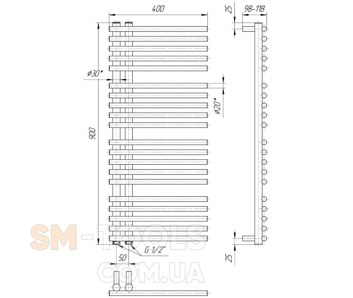 Водяной полотенцесушитель Премиум Марсель 900x400 с межосевым растоянием для подключения 50мм, диметр подключения G 1/2'' состоит из 20 ребер. Полотенцесушитель Премиум Симфония производсветнного предприятия Mario изготовлен из нержавеющей стали АІSI 304 может быть оборудован 300W электрическим теном.