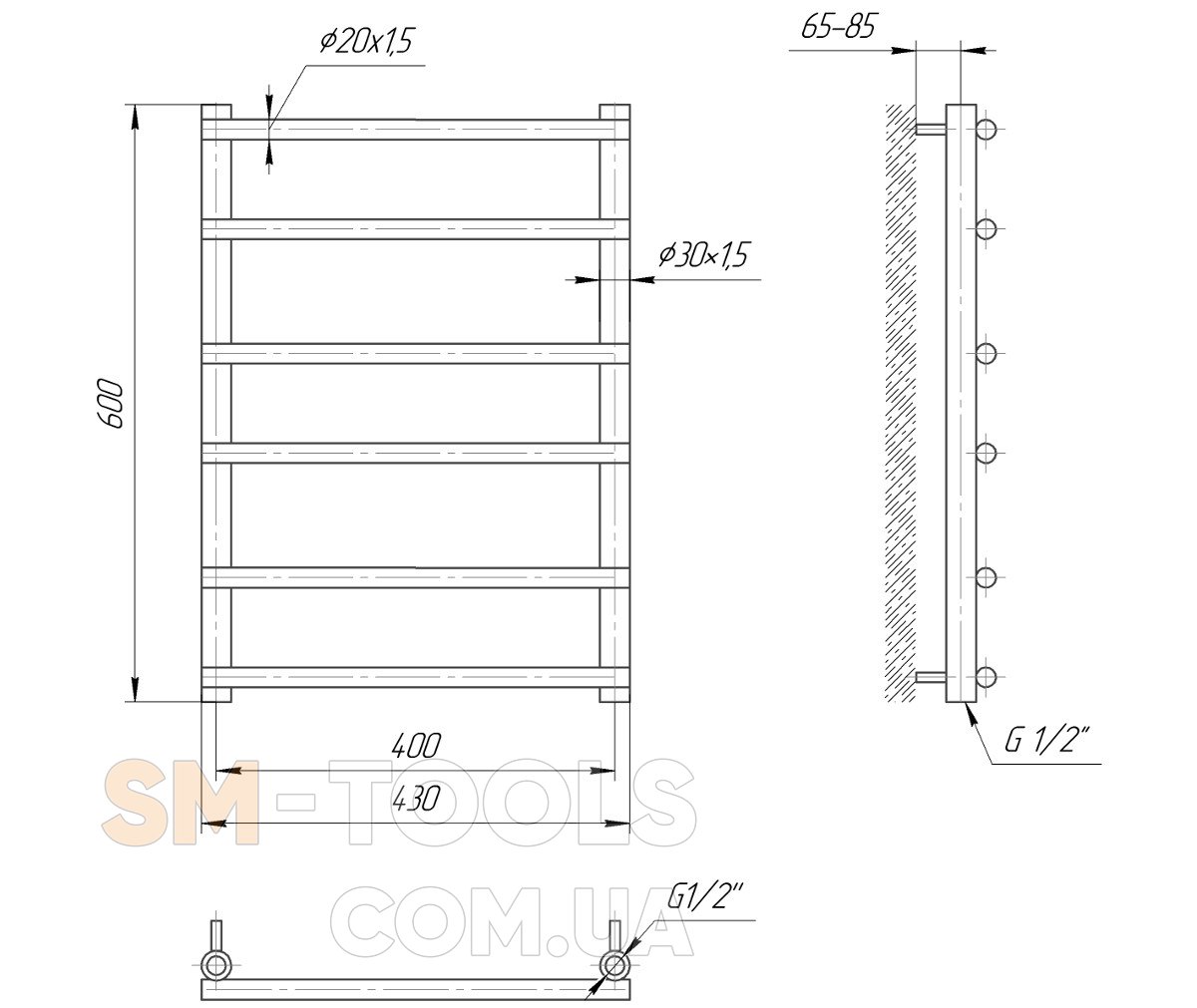 Водяной полотенцесушитель Турин 600х400 с межосевым растоянием для подключения 400мм, диметр подключения G 1/2'' состоит из 6 ребер. Полотенцесушитель Турин производсветнного предприятия Mario изготовлен из нержавеющей стали АІSI 304 может быть оборудован 300W электрическим теном.