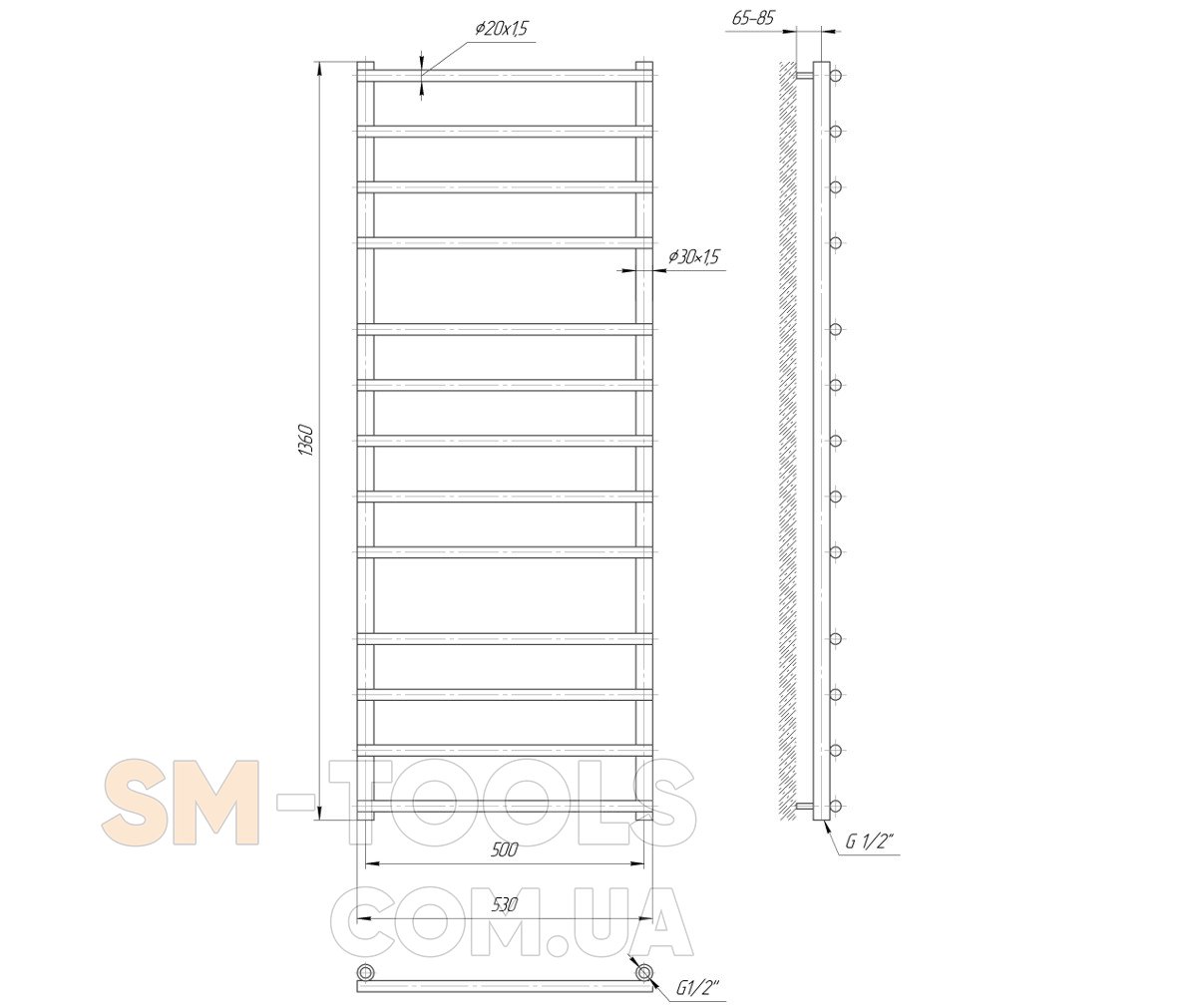 Водяной полотенцесушитель Турин 1360х500 с межосевым растоянием для подключения 500мм, диметр подключения G 1/2'' состоит из 13 ребер. Полотенцесушитель Турин производсветнного предприятия Mario изготовлен из нержавеющей стали АІSI 304 может быть оборудован 600W электрическим теном.