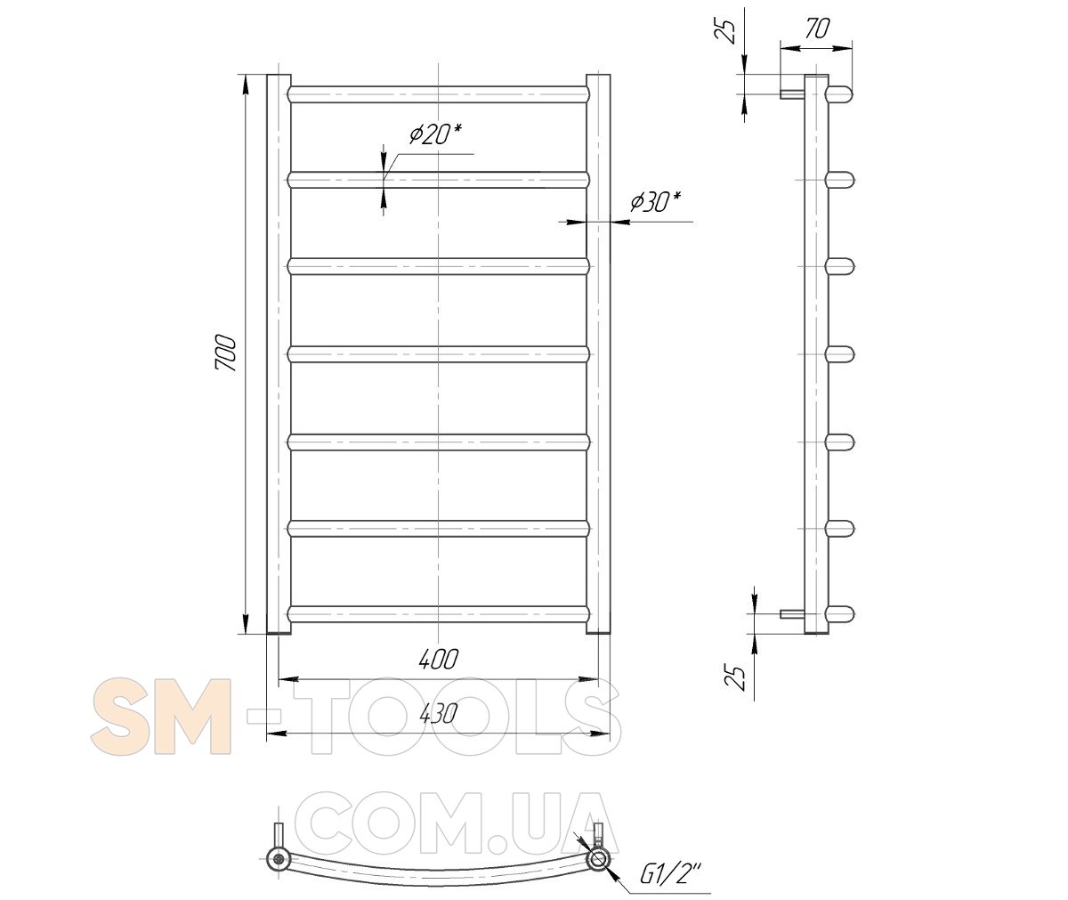 Водяной полотенцесушитель Классик 700х400 с межосевым растоянием для подключения 400мм, диметр подключения G 1/2'' состоит из 7 ребер. Полотенцесушитель Классик производсветнного предприятия Mario изготовлен из нержавеющей стали АІSI 304 может быть оборудован 300W электрическим теном