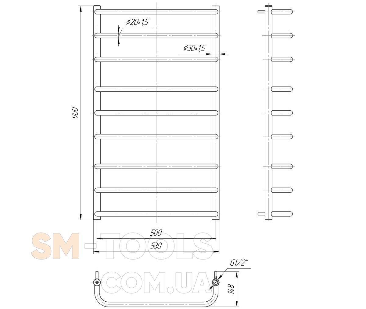 Водяной полотенцесушитель Стандарт 900х500 с межосевым растоянием для подключения 500мм, диметр подключения G 1/2'' состоит из 9 ребер. Полотенцесушитель Стандарт производсветнного предприятия Mario изготовлен из нержавеющей стали АІSI 304 может быть оборудован 300W электрическим теном.