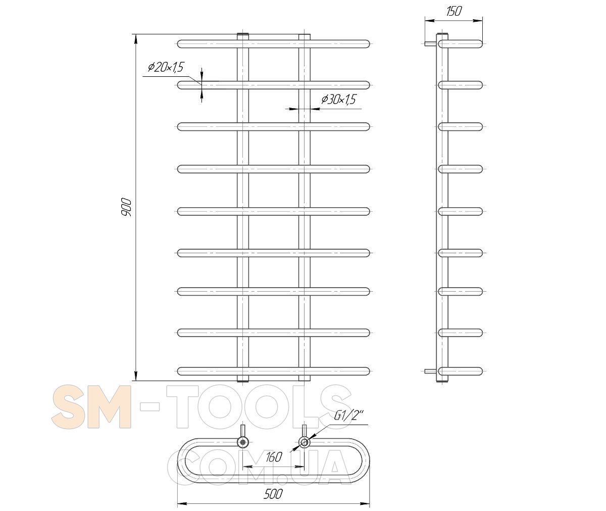 Водяной полотенцесушитель Саxара 900х500 с межосевым растоянием для подключения 160мм, диметр подключения G 1/2'' состоит из 9 ребер. Полотенцесушитель Саxара производсветнного предприятия Mario изготовлен из нержавеющей стали АІSI 304 может быть оборудован 300W электрическим теном.