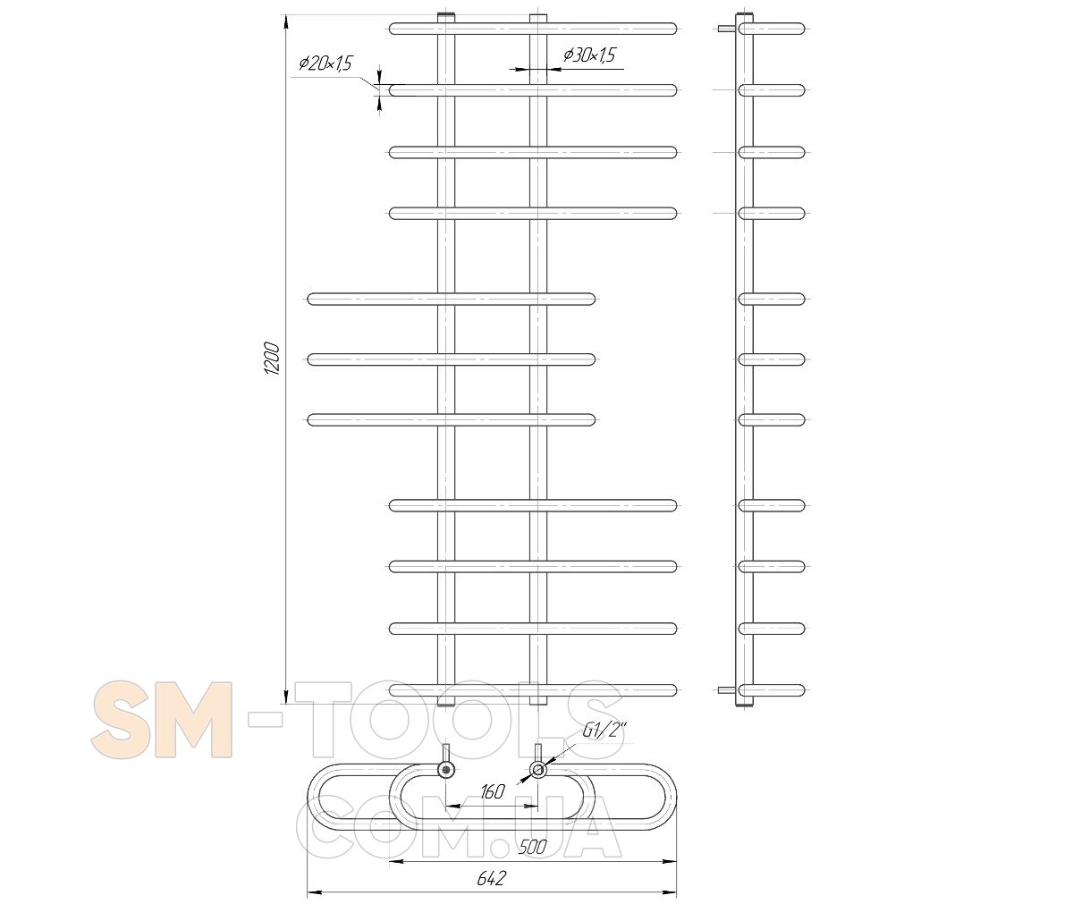 Водяной полотенцесушитель Парус 1200х500 с межосевым растоянием для подключения 160мм, диметр подключения G 1/2'' состоит из 11 ребер. Полотенцесушитель Парус производсветнного предприятия Mario изготовлен из нержавеющей стали АІSI 304 может быть оборудован 600W электрическим теном.