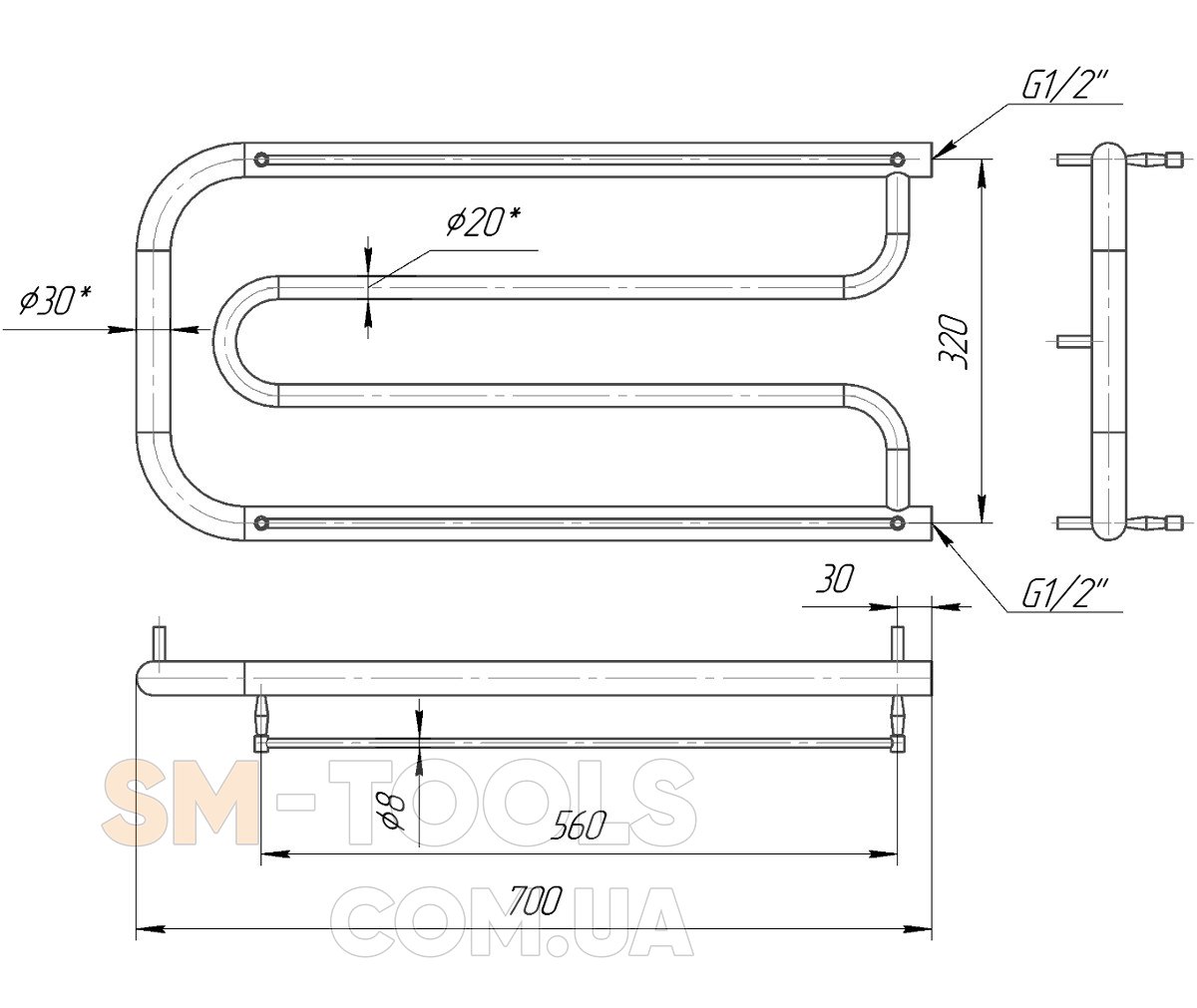 Водяной полотенцесушитель Фокстрот 320х700 с межосевым растоянием для подключения 320мм, диметр подключения G 1/2'' состоит из 1 гиб ребер. Полотенцесушитель Фокстрот производсветнного предприятия Mario изготовлен из нержавеющей стали АІSI 304 может быть оборудован W электрическим теном.