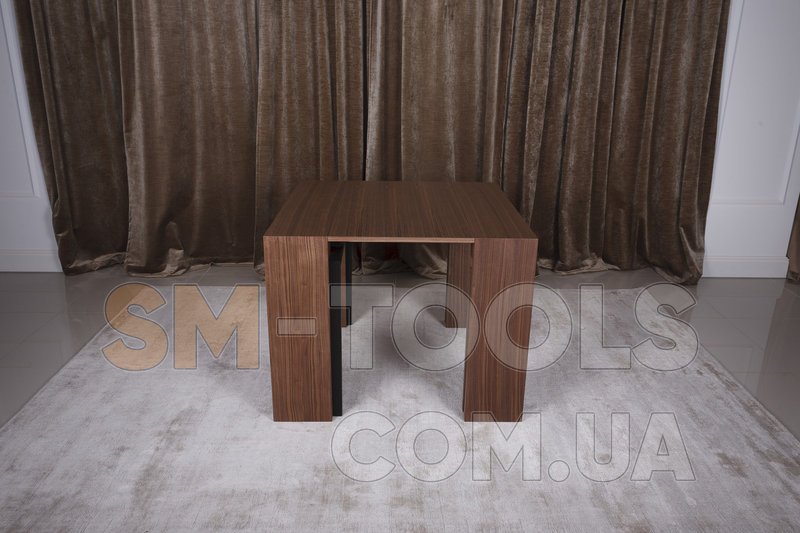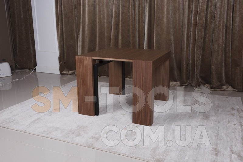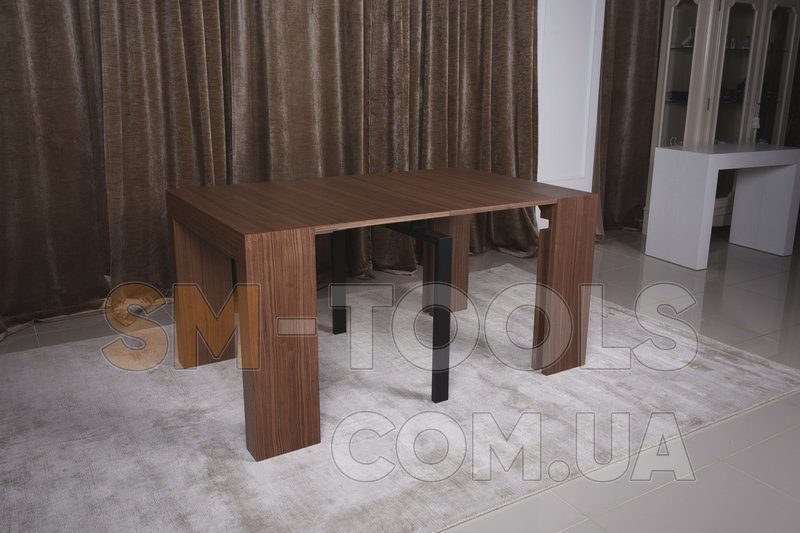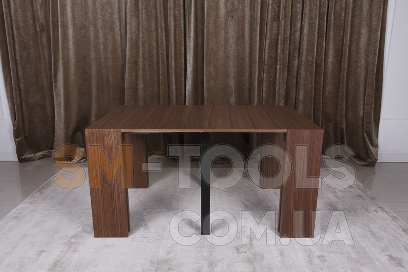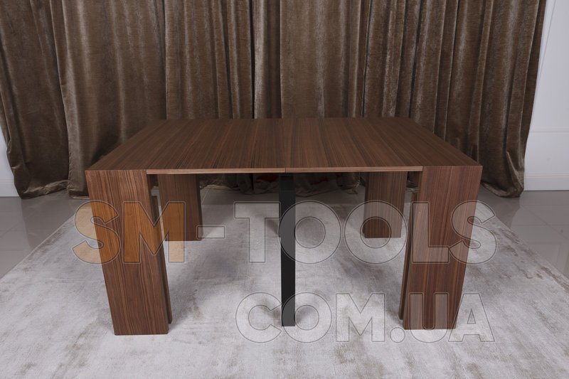 В сложенном виде это консоль шириной 45 см, с одной вставкой получаем компактный квадратный стол, а добавляя вставки еще, стол растет до просторного обеденного длиною 200 см.