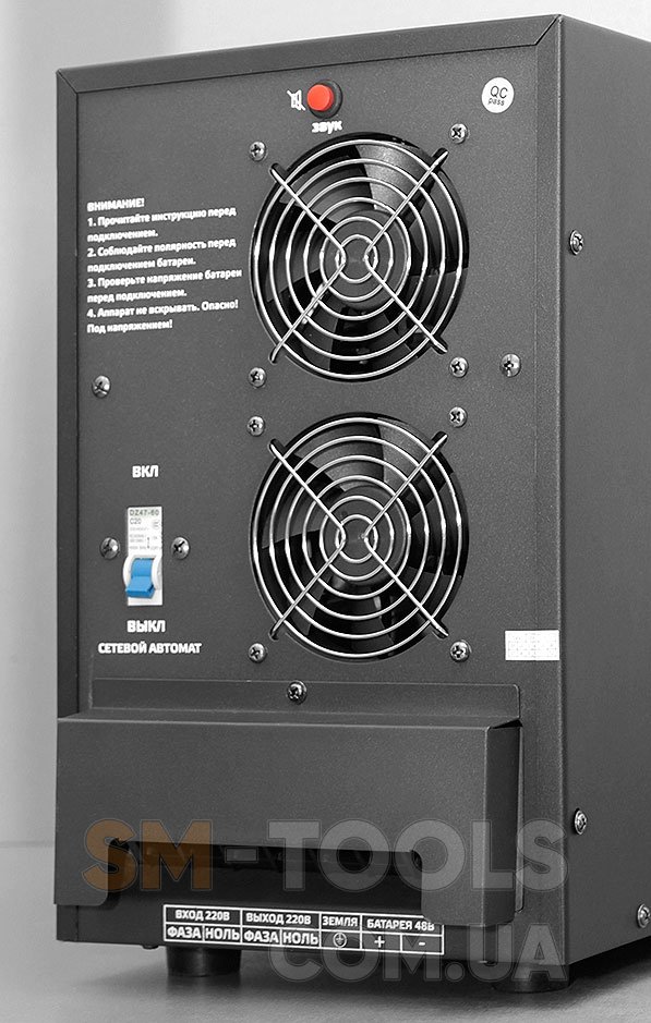 При работе от аккумулятора UPS-3000 генерирует синусоидальное напряжение с частотой 50 Герц (±0,5%) и номиналом на выходе 220В (±2%). Для поддержания бесперебойного энергоснабжения могут использоваться аккумуляторные батареи любой емкости, при условии что ток заряда не превышает 15А.