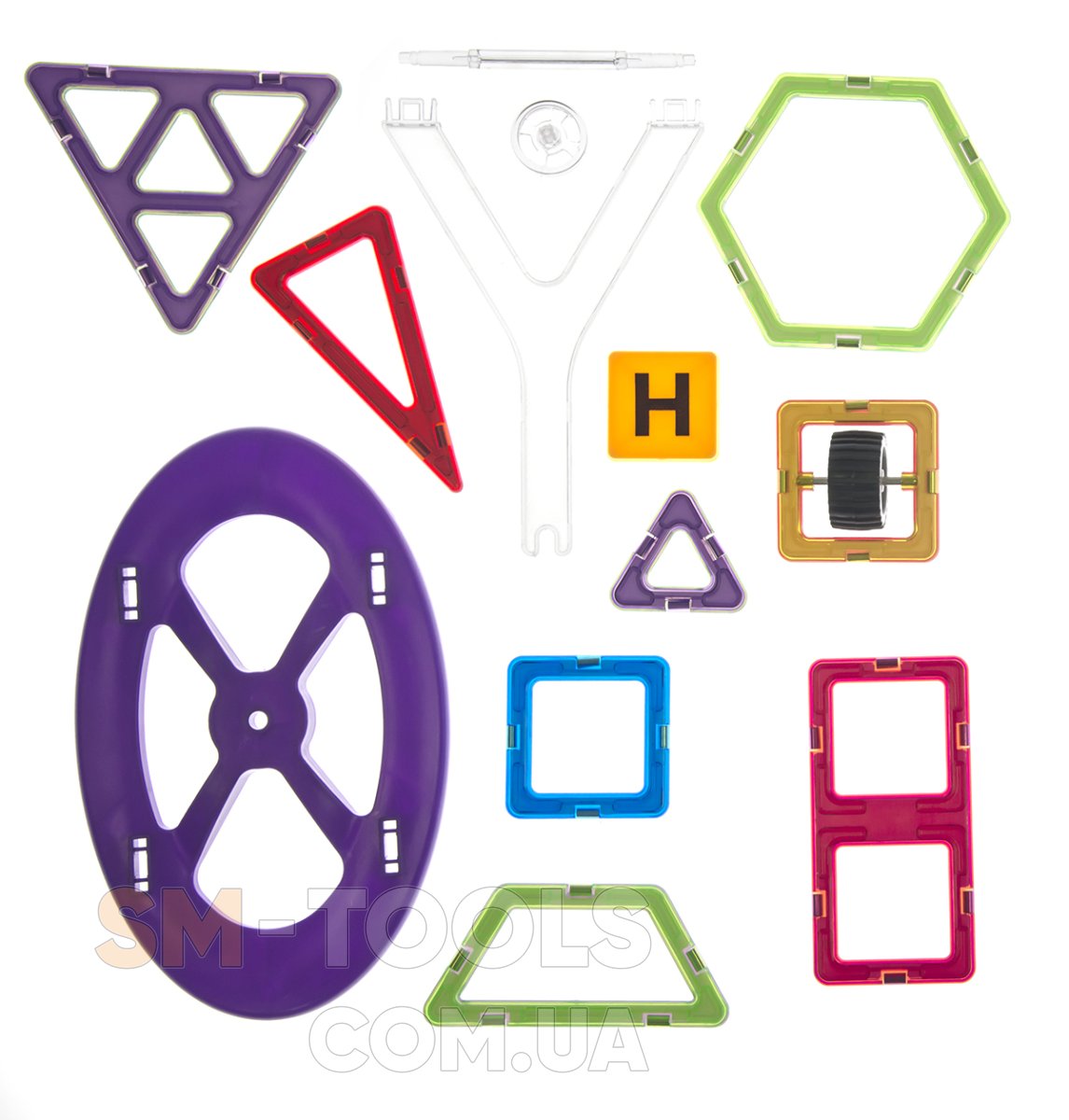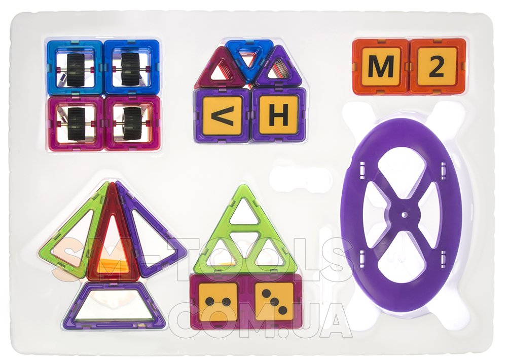 Набор состоит из 166 элементов различной формы и цветов: треугольников, квадратов, шестиугольников, трапеций, а также деталей с колесиками и буквами. По периметру каждой детали размещены магниты, поэтому фиксация между ними крепкая и надежная.