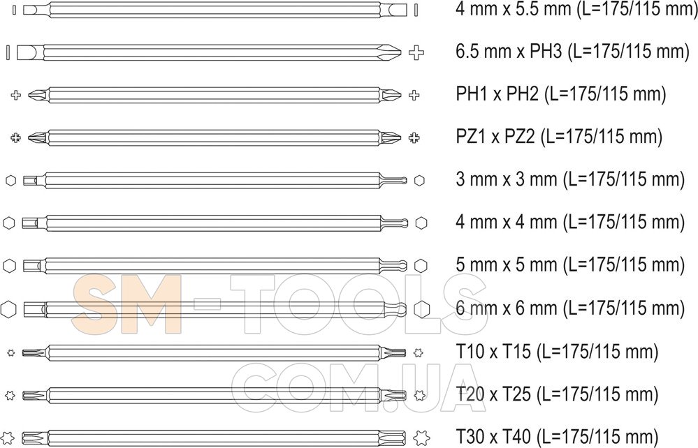 Вид наконечника отвертки/бит плоский (SL)/крестообразный (Phillips/PH)/крестообразный (Pozidriv/PZ)/звездообразный (Torx/T)/шестигранник (HEX)