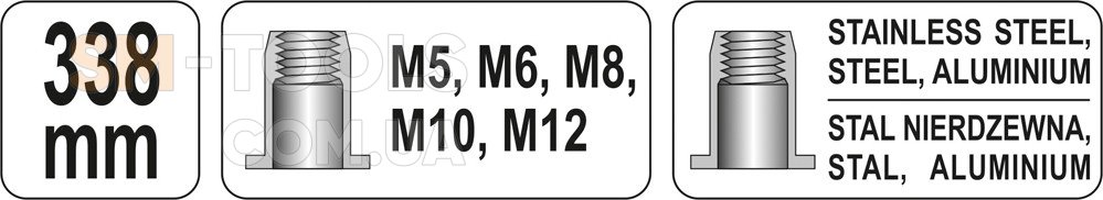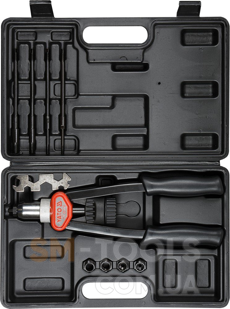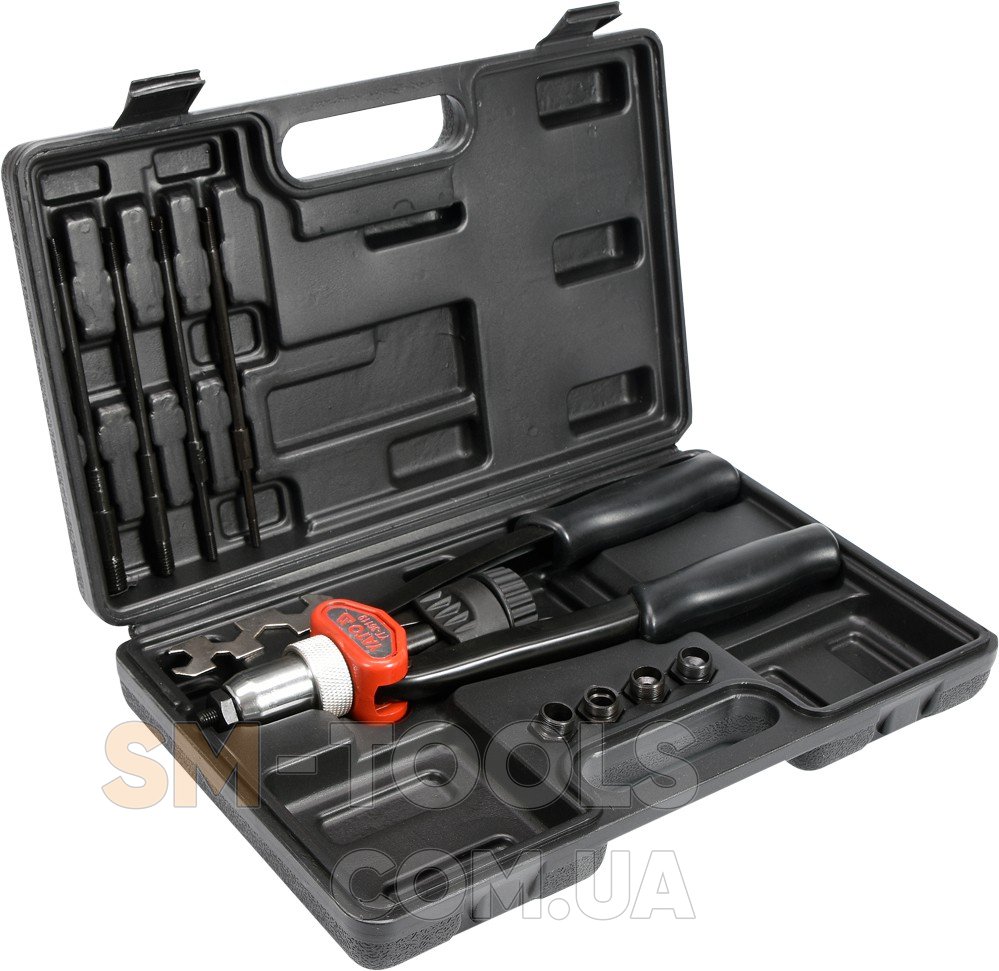 Заклепочник YATO для резьбовых заклепок применяется в крепежных работах для прочного соединения материалов при помощи резьбовых заклепок М5, М6, М8, М10, М12. Изготовлен из высококачественной хром-ванадиевой стали. Использование резьбовой заклепки, в отличии от обычной, позволяет прочно скрепляет тонколистовые материалы, замыкая их между собой. Продуманная конструкция пистолета для резьбовых заклепок обеспечит легкое и быстрое выполнения операций. Металлическая ручка с резиновыми накладками для удобного использования.