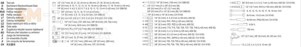 Головки 3/8":9, 10, 11, 12, 13, 14, 15, 16 мм (L=28 мм); 17, 18, 19 мм (L=30 мм);