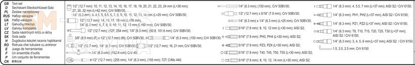 Головки ½": 10; 11; 12; 13; 14; 15; 16; 17; 18; 19; 20; 21; 22; 23; 24 мм, L= 38 мм); 27; 30; 32 мм, L= 42 мм