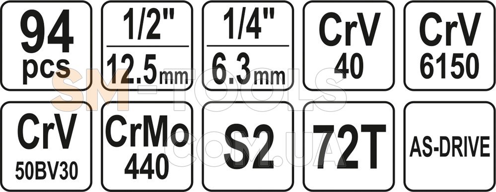 Биты 5/16": TORX: T40; T45; T50; T55 крестообразным шлицем PHILIPS: Ph3; Ph4 крестообразным шлицем Pz3; Pz4