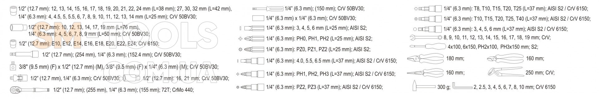 Биты впрессованные в головки 1/4" (L=37mm): Slotted: 4, 5.5, 6.5 mm; Phillips: PH1, PH2, PH3; Pozi: PZ2, PZ3; Torx: T8, T10, T15, T20, T25; Torx с отверстием: T10, T15, T20, T25, T40; Hex: 3, 4, 5, 6 mm - 22шт