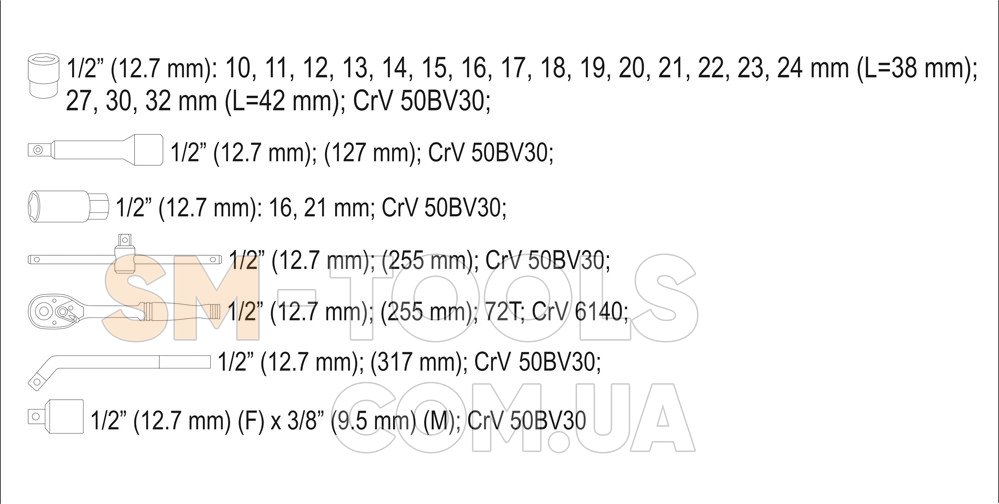 Головки 1/2": 10, 11, 12, 13, 14, 15, 16, 17, 18, 19, 20, 21, 22, 23, 24 мм (L=38 мм); 27, 30, 32 мм (L=42 мм);