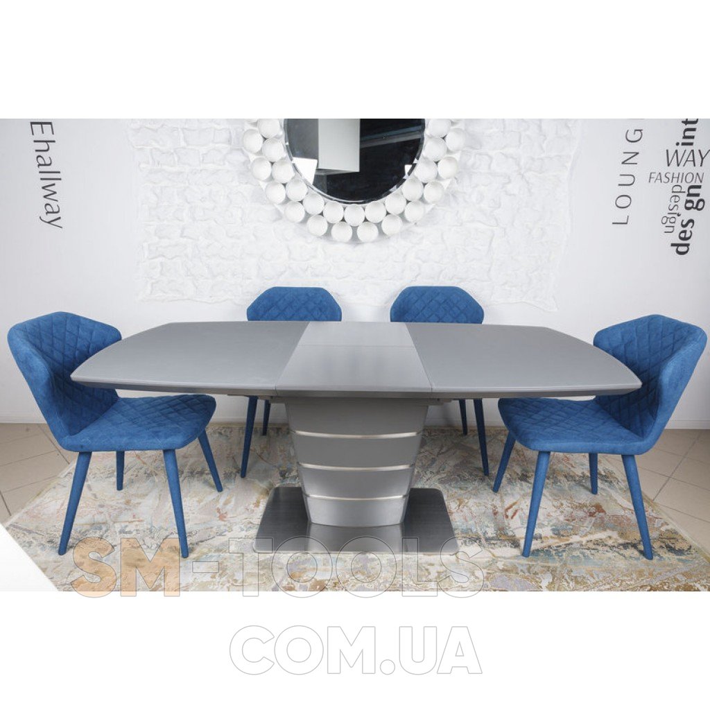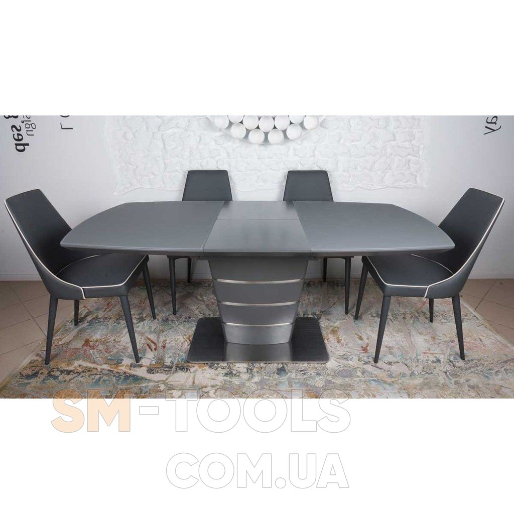 Столешница сделана из матового закаленного стекла графитового цвета на базе из МДФ. На такой столешнице практически не заметны отпечатки пальцев и следы от посуды, но мы рекомендуем использовать подставки или салфетки под тарелки и столовые приборы. Дополнительные панели располагается посередине, сделаны из МДФ в тон столешнице. Чтобы разложить стол, нужно просто раздвинуть стеклянную столешницу и достать вставки. Детали раздвижного механизма сделаны из металла и рассчитаны на длительный срок эксплуатации.