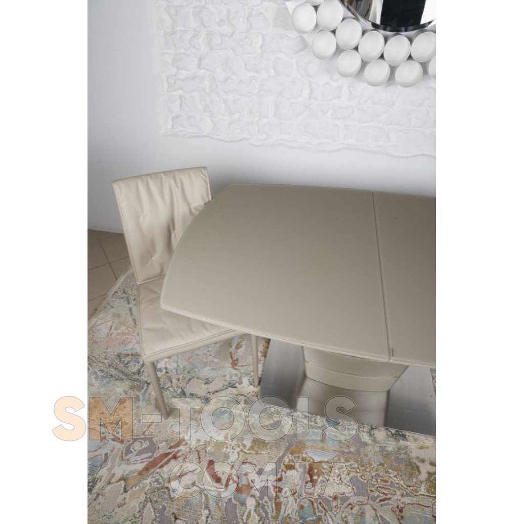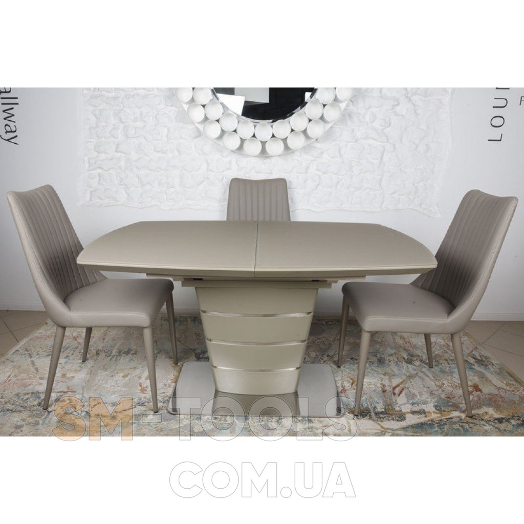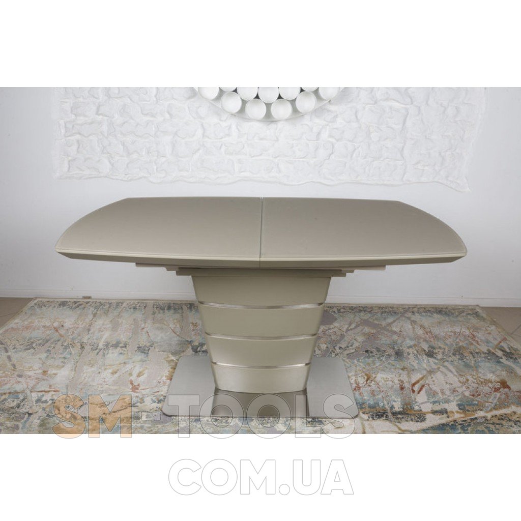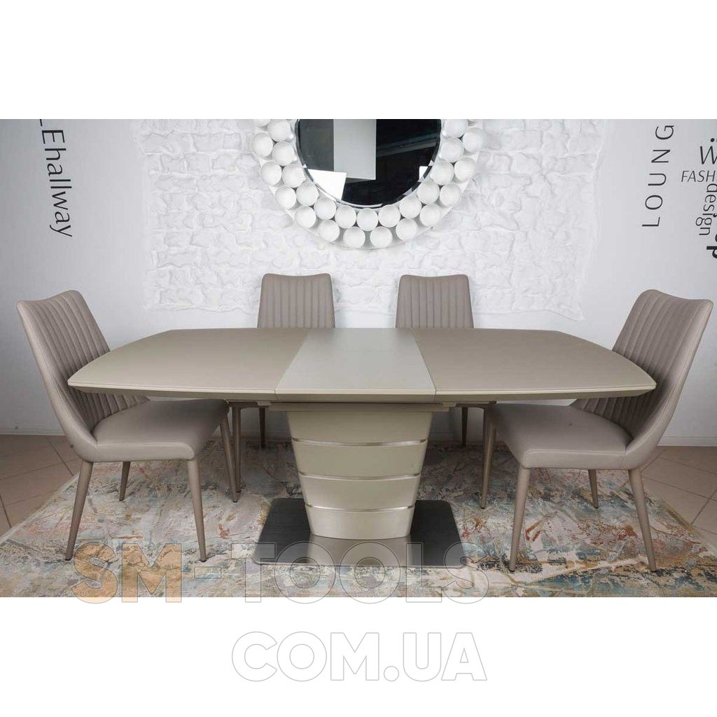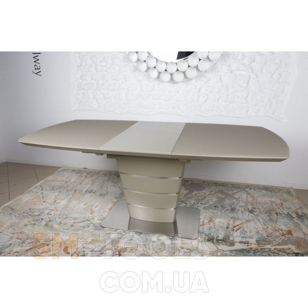 Столешница сделана из матового закаленного стекла цвета мокко на базе из МДФ. На такой столешнице практически не заметны отпечатки пальцев и следы от посуды, но мы рекомендуем использовать подставки или салфетки под тарелки и столовые приборы. Дополнительные панели располагается посередине, сделаны из МДФ в тон столешнице. Чтобы разложить стол, нужно просто раздвинуть стеклянную столешницу и достать вставки. Детали раздвижного механизма сделаны из металла и рассчитаны на длительный срок эксплуатации.