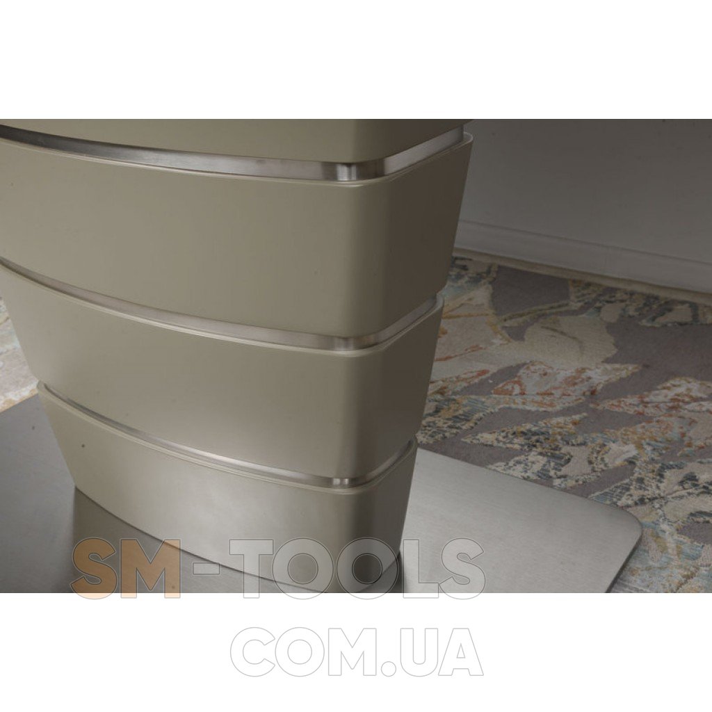 Ножка из МДФ в виде пьедестала располагается на платформе из нержавеющей стали. Ножка декорирована полосами из металла.