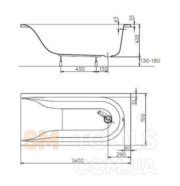 MIRRA ванна прямоугольная 140*70 см, с ножками, элементами крепления