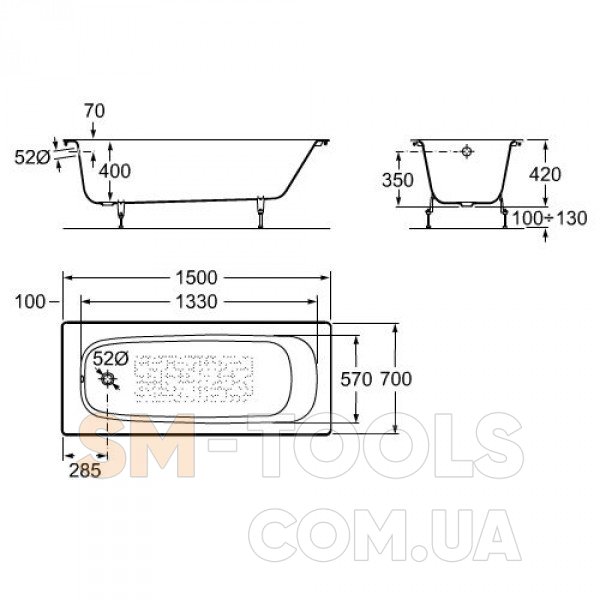 Эмалированная чугунная ванна, размер 150х70 см, с противоскользящим покрытием.