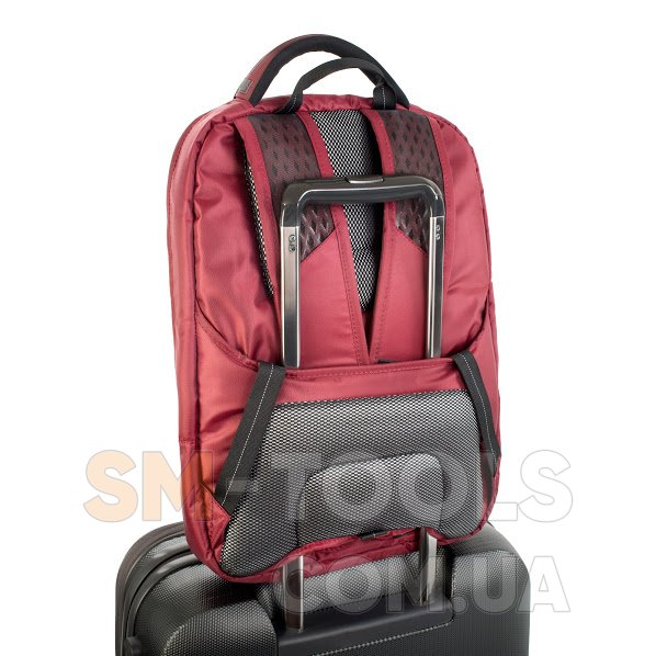 Для удобства транспортировки рюкзака, конструкцией TechPac предусмотрена возможность переноски самого рюкзака непосредственно на выдвижной телескопической ручке чемодана или сумки. Для этого, в спинке рюкзака расположен специальный проем, продев через который ручку чемодана или сумки, рюкзак надежно будет зафиксирован.
