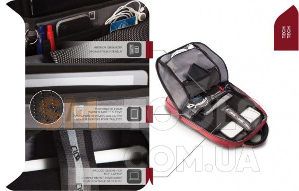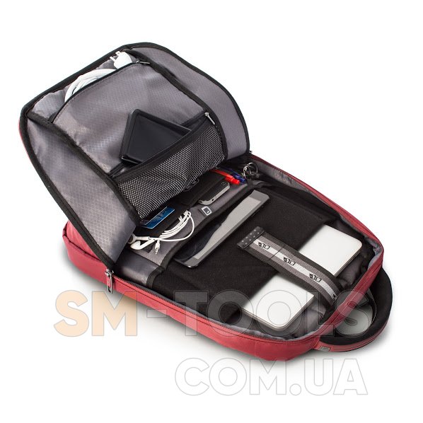 Отделения для транспортировки ноутбука диагональю 15.6″, планшета 10″ и смартфона выполнены из легкого, перфорированного неопрена. Неопрен дополнительно обшит флисовой подкладкой. Это позволяет защитить ценные вещи от нежелательных механических повреждений и царапин. Отделение с функциональным органайзером, имеет карабин с фиксатором для ключей, а так же множество дополнительных отделений для различных аксессуаров.
