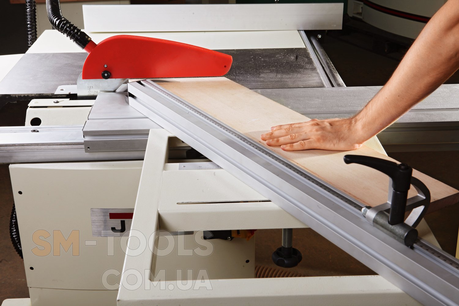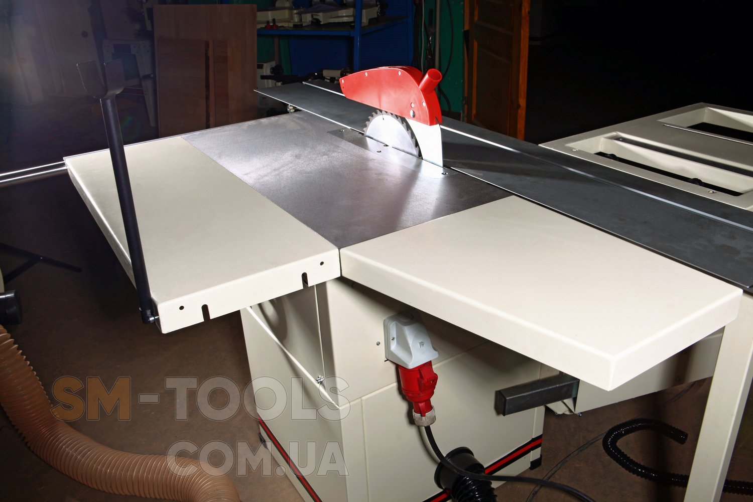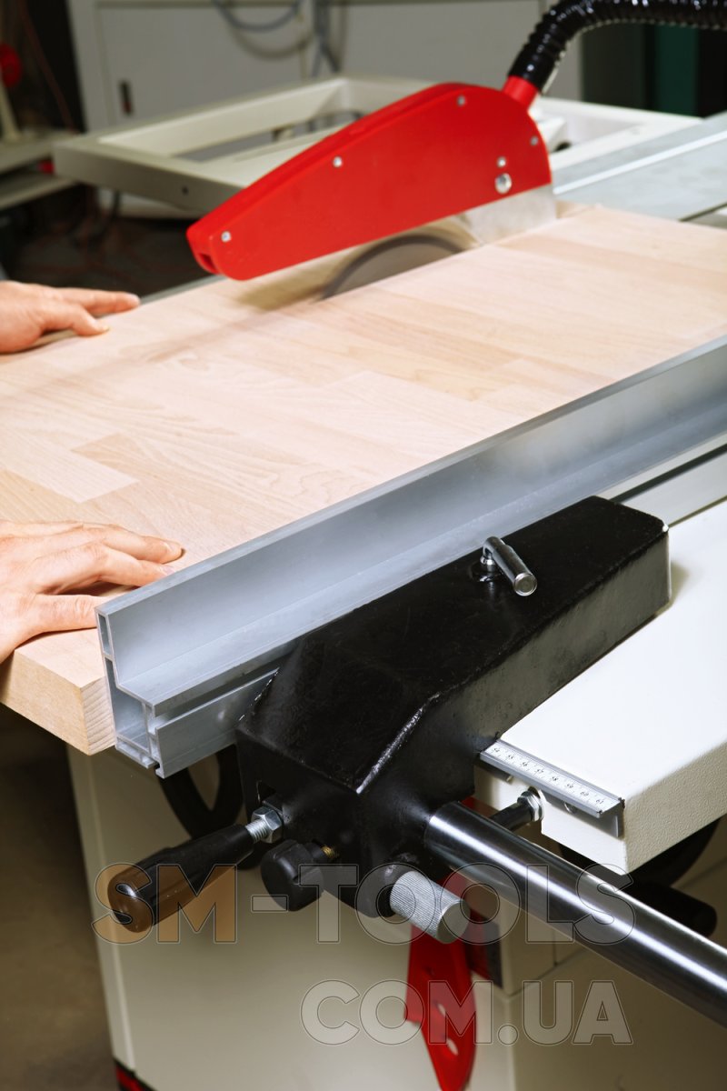 Основа конструкции пилы – металлическая тумба, внутри которой установлены асинхронный трехфазный двигатель, механизмы регулировки по высоте и углу наклона пильного модуля (он выполнен из чугунной отливки) и пылесборный кожух со 100-миллиметровым патрубком подключения к вытяжной установке. Рабочий стол чугунный, вдоль него проходит жесткая цилиндрическая направляющая, по которой перемещается параллельный упор с эксцентриковой фиксацией – эти решения полностью соответствуют профессиональному стандарту. Рабочая поверхность может быть увеличена за счет установки расширителя и удлинителя, сделанных из листовой стали – они штатно поставляются вместе с пилой.