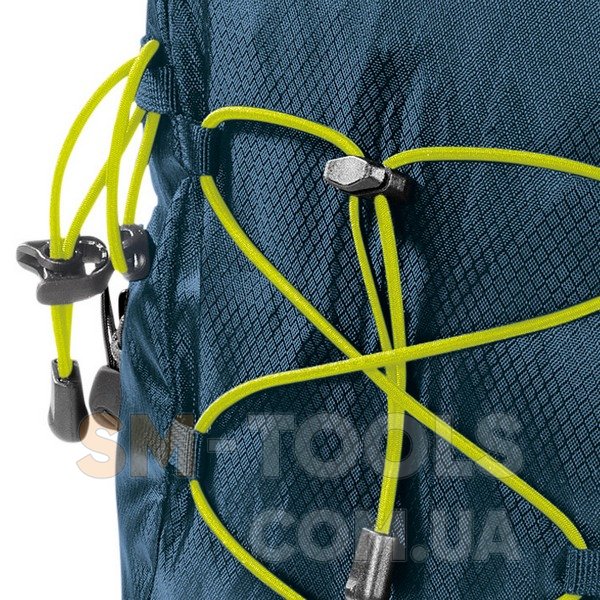 Trekking poles holder (1) - держатели для треккинговых палок размещаются в верхней и нижней части фасада треккингового рюкзака и, как правило, представляют собой комбинацию нижних петель и верхних стяжных эластичных шнуров с фиксатором. Реже нижние петли заменяются такими же стяжными шнурами. Такие держатели позволяют надежно фиксировать треккинговые палки и не загружать ими внутреннее пространство рюкзака. Данный рюкзак имеет одну пару креплений для одной или двух треккинговых палок.