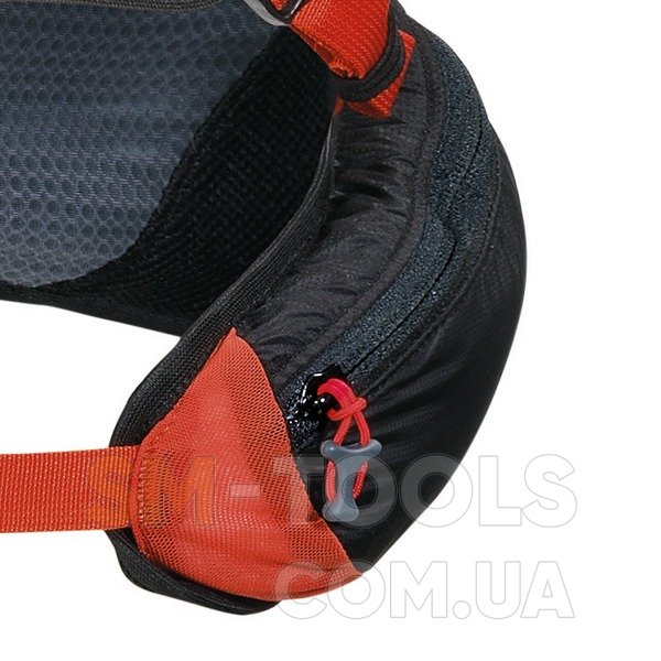 Trekking poles holders (2) - держатели для треккинговых палок размещаются на фасаде бегового рюкзака и представляют собой комбинацию верхних и нижних стяжных эластичных шнуров с фиксаторами. Такие держатели позволяют надежно фиксировать треккинговые палки и не загружать ими внутреннее пространство рюкзака. Данный рюкзак имеет две пары креплений для треккинговых палок, а нижние стяжные шнуры заменены специальными карманами из эластичной сетки.