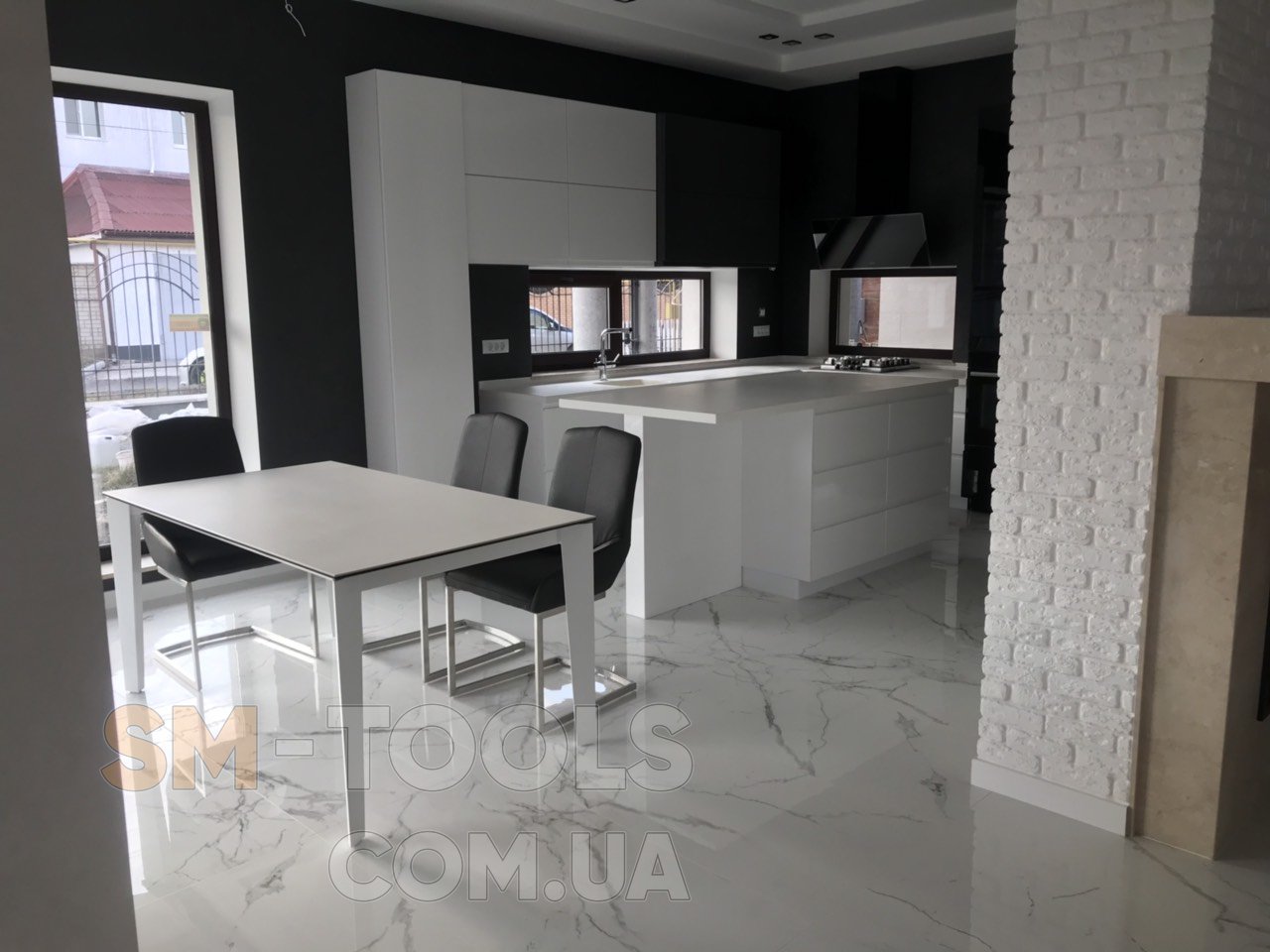 Столешница сделана из стеклокерамики белого цвета. Поверхность матовая, на ней практически не видны отпечатки рук, крошки или просыпанный сахар. Дополнительные панели сделаны из окрашенного в тон столешницы МДФ.